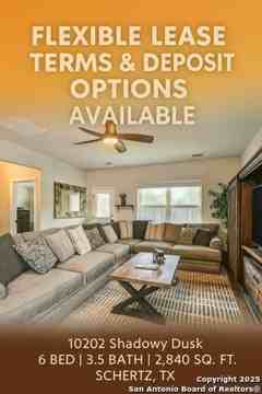 Now offering flexible lease terms and deposit options! Experience exceptional living in this beautifully maintained two-story Lennar home located in the sought-after Willow Grove subdivision of Schertz. Boasting over 2,800 square feet, this expansive 6-bedroom, 3.5-bath residence features a versatile open-concept layout designed for both comfort and functionality. The main level includes a spacious living area, an elegant kitchen with a large island, breakfast bar, and ample countertop space, plus a dedicated dining area ideal for gatherings. The primary suite offers a serene retreat on the first floor, complete with a luxurious ensuite bath and walk-in closet, while the upstairs loft and additional bedrooms provide flexible space for work, play, or guests. Set on a large .24-acre lot with open green space behind and only one neighboring property, this home ensures both privacy and tranquility. Conveniently located near IH-35, shopping, dining, and top-rated Schertz-Cibolo-Universal City ISD schools, this move-in ready home perfectly balances space, style, and convenience-making it the ideal place to call home.