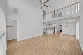 The whole house features an open-concept floor plan that combines the living, dining, and kitchen areas, abundant natural light, and vinyl plank flooring throughout the main living spaces. The kitchen is a true centerpiece, showcasing white cabinets, granite countertops, stainless steel appliances, a walk-in pantry, and a large island with seating for four. Stylish gold light pendants and recessed lighting elevate the space, while the adjacent dining area comfortably seats 8+ and is framed by two large windows that bring in warm natural light.