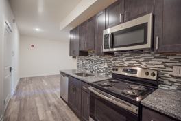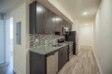 The open living and kitchen space includes contemporary finishes, stainless steel appliances, and hardwood-style flooring, creating a stylish environment to relax or entertain. Residents enjoy an in-unit washer and dryer, central heating and cooling, ample closet space, and access to the building's private gym.