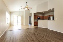 Make the most of the open floor plan of this two-bedroom rental home in Mesa. The living room's vaulted ceiling and fan promote a comfortable atmosphere for conversing with friends or streaming your favorite shows. A tiled floor adds style to the dining room, where there's a sliding glass door for easy access to the covered patio in the fenced backyard. In the kitchen, two walls of hardwood cabinets and a walk-in pantry make it easy to keep ingredients and dishes well-organized. Sleep deeply as the overhead fan in the master bedroom delivers a gentle breeze. Start each day by choosing an outfit from the private bathroom's walk-in closet and dressing at the dual-sink vanity.