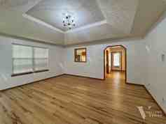 Down the hall, you'll find a laundry closet with washer/dryer hookups and wire storage shelving. Two bedrooms on the left each have ceiling fans and open closets. The main bathroom has natural wood cabinetry and a bathtub-shower combo. The private primary bedroom suite offers a tranquil retreat with a vaulted ceiling, large windows, and an open walk-in closet. The updated en-suite bathroom features a marble counter, a sleek grey cabinet, and a spacious walk-in shower.