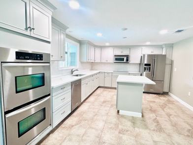 Comes with all appliances including washer and dryer. The large kitchen has a double oven, dishwasher, large window over sink, island and built in pantry.