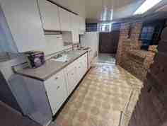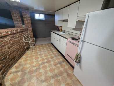 * Eat-in kitchen with functional antique pink stove and charming brick accents