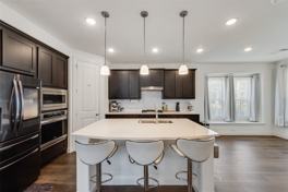 Gourmet Kitchen: Features an island breakfast bar, granite countertops, stainless steel appliances, and abundant storage.