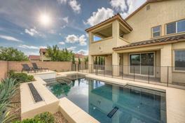 This upgraded 5-bedroom, 4.5-bathroom home offers spacious, flexible living with a rare 3 en-suite layout, including a private downstairs suite complete with its own entrance, kitchenette, living area, laundry, and ¾ bath, ideal for guests or multi-gen living. The open-concept main level features a gourmet kitchen with stainless steel appliances, quartz countertops, island, breakfast bar, and designer backsplash, flowing seamlessly into the dining and living areas. Upstairs includes a versatile loft and a luxurious primary suite with balcony, dual sinks, soaking tub, walk-in shower, and large closet. A 3rd en-suite bedroom with full bath and walk-in closet is also upstairs. The private backyard is designed for relaxation and entertainment with a heated PebbleTec pool, spa, waterfall, firepit, artificial turf, dog run, and covered patio. Situated on a corner lot with no rear neighbors, the home also features a 3-car garage, EV charging, solar power, and partial Strip and city views.