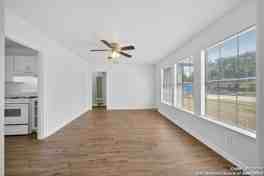 Charming 1-story home featuring 3 bedrooms with carpet and ceiling fans for comfort. The kitchen boasts white cabinets, matching appliances, and gas cooking for a modern, functional space. The bathroom offers a single vanity and a shower/tub combo. Enjoy outdoor living with a large covered patio, perfect for entertaining or relaxing. Quick access to Hwy 90, just 12 minutes to Southtown and Downtown, and a short drive to Kelly AFB. Functional floor plan with plenty of natural light throughout.