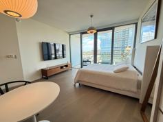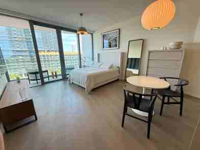 Welcome to this newer studio with one assigned covered parking stall at the luxurious Koula in Ward Village. This unfurnished unit features engineered wood flooring throughout, latch brand smart lock entry system, central air-conditioning, walk-in closet, private covered lanai, 9 1/2 ft ceiling with floor to ceiling windows and views. The open kitchen comes fully equipped with custom designed wood cabinetry with glass upper cabinets, natural stone countertops, Miele kitchen appliances and Grohe fixtures. A 10x10 storage space located right next to the unit is available for rent for an additional cost.