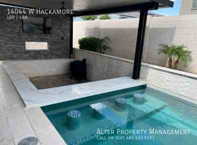 14044 W Hackamore Dr is a 4 bedroom, 3 bathrooms apartment for rent. It is located in Surprise. It has apartment amenities including walk-in closets, dishwasher, fireplace, high ceilings, and outdoor space. Cats and dogs are allowed, making it a pet-friendly apartment.