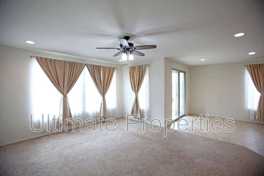 Large 4 Bedroom + 2 Bathrooms. Carpet and tile throughout. Ceiling fans in each room. Kitchen complete with large center island, fridge, Stove, microwave and dishwasher. Lots of counter and cabinet space. Open floor plan with sliding glass door leading from living room right outside. Primary has huge bathroom with dual sinks, garden tub and walk in closet. Private backyard with covered patio. Corner lot in Cul De Sac, next to greenbelt.