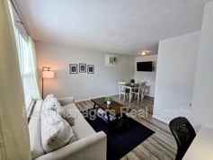 Inside, the open layout features a cozy living room with modern décor and a fully equipped eat-in kitchen with stainless-steel appliances and updated cabinetry. The spacious bedroom provides a comfortable retreat with ample storage, while the bathroom showcases sleek, contemporary finishes.