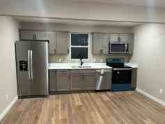 800 square feet, brand new interior. Kitchen, bathroom, one bedroom, laundry room and a beautiful living room with vaulted ceiling are on the ground floor. Stairway leads to upper story bedroom. Brand new kitchen includes dishwasher, fridge and range and microwave. Washer and dryer not included. Home has brand new central heating and air conditioning. Off-street parking options in back yard, accessible by convenient alley.