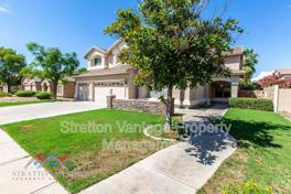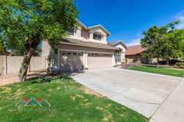 Prime Gilbert Location! This spacious 5-bedroom home is full of charm and functionality. Step inside to soaring vaulted ceilings and a dramatic curved staircase. The main level offers formal living and dining areas, plus a cozy family room with fireplace that opens to the updated kitchen featuring Corian counters, full-height backsplash, abundant storage, and a wine fridge. A full bedroom and bathroom downstairs provide extra convenience.