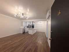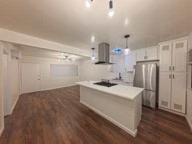 This spacious unit offers a bright open layout with laminate flooring, designer lighting, and a modern kitchen featuring a large island, stone countertops, modern cabinetry, and stainless steel appliances.