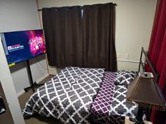 Furnished bedroom, shared bath and kitchen.