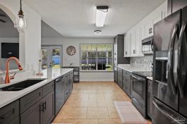FULLY FURNISHED....Nestled in the heart of Gulf Breeze, this beautifully updated 5-bedroom, 2.5-bath residence offers an ideal blend of style, space, and serenity — all just minutes from the beach. From the moment you arrive, you're greeted by a manicured front yard with tropical landscaping, a welcoming covered porch, and timeless curb appeal. Step inside to discover a completely remodeled kitchen that will impress any home chef — boasting sleek two-tone cabinetry, quartz countertops, modern herringbone tile backsplash, black stainless appliances, and a bold copper pull-down faucet at the oversized undermount sink. Entertain effortlessly with a spacious open floor plan that flows into a large sunroom, flooded with natural light and framed by gorgeous picture windows — perfect for game nights, morning coffee, or indoor-outdoor dining. The primary suite is a relaxing retreat with plush carpeting, crown molding, and direct access to the sunroom.