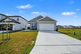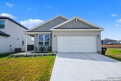 This nearly new single-story home offers 4 bedrooms and 2 bathrooms in the highly sought-after Vista Real subdivision. Step inside through the oversized entryway and into the open-concept living, dining, and kitchen areas, where stunning vinyl plank flooring and abundant natural light create a warm, inviting atmosphere. The spacious kitchen is designed with both style and functionality in mind, featuring granite countertops, upgraded shaker-style cabinets with custom pulls, a large island with an undermount sink, and matching stainless steel appliances. For added convenience, a refrigerator, washer, and dryer are included. The private master suite is thoughtfully separated from the secondary bedrooms and boasts a luxurious en-suite bathroom complete with dual vanities, a large walk-in shower, and a spacious walk-in closet. The three additional bedrooms are generously sized, providing plenty of space for family, guests, or a home office. With quick access to Loop 1604, Interstate 10, and just a short drive to Randolph AFB, this home offers both comfort and convenience. A true pleasure to show!