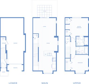 Set on an end location, these homes have awesome backyards off the living room. There are two bedrooms and two full bathrooms up top. On the lower level, there's a full bathroom and room for two cars – one in and one out.