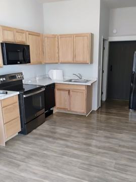 Brand-new kitchen appliances including oven, refrigerator, over-the-range microwave, and dishwasher