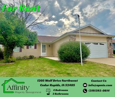 1205 Wolf Dr Nw is a 4 bedroom, 3 bathrooms apartment for rent. It is located in Cedar Rapids. It has apartment amenities including carpet, fireplace, dishwasher, balcony, and in-unit laundry.