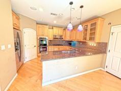 * Gourmet Kitchen with Stainless Steel Appliances, Granite Slab Counter, Whirlpool Appliances Including Double Ovens and Gas Range, Trash Compactor, Modern Pendant Lighting, Bar Seating, Pantry, Large Eat-In Kitchen Area