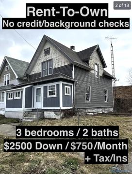 If you are tired of increasing rents, here is your opportunity to finally own your home that needs a bit TLC. We require small downpayment and create a 30-year mortgage for you. No credit or background checks. Minimum income verification to ensure you can afford monthly mortgage payments.