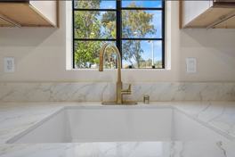Modern kitchen with quartz countertops, custom cabinets, gold accents, and all appliances including microwave, stove, dishwasher, and refrigerator