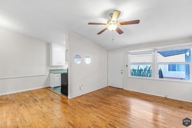 Step inside and take in those airy vaulted ceilings and warm wood floors—classic Mar Vista charm with a modern touch. The living space flows easily into a crisp white kitchen, where stainless steel appliances (including a gas stove and full-size fridge) keep things clean and functional without feeling cramped.