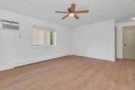 Bright, spacious living area with a contemporary design, new modern flooring, light fixtures, ceiling fans, and large, efficient windows throughout.