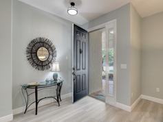 Welcome to this impeccably maintained and updated home located in gated community with community pool & clubhouse. Home offers modern comfort and style, featuring a designer kitchen with quartz countertops, S/S appliances, a breakfast bar, & breakfast nook. Luxury plank flooring flows seamlessly throughout main living areas. Spacious primary bedroom includes W/I closet & a spa-like ensuite with double vanity & custom W/I tile shower. Guest room bath also has custom W/I shower. Enjoy serene mornings or relaxing evenings on private, screened, & tiled porch-perfect for entertaining or unwinding.