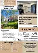 Unit is occupied One-bedroom one bath unit with open concept, kitchen, living room and dining room. Unit includes engineered hardwood flooring, appliances, microwave, stove and refrigerator. Laundry in building, quartz countertops, central AC and recessed lighting. There is an intercom in each unit from the front entrance of the building. The location of the property is ideal, perfectly situated in West Plymouth, minutes from Rt 3, Rt 44 and Downtown Plymouth. You are on the Gatra bus line and withing walking distance to Market Basket. You are located within less than a mile is Colony Place.