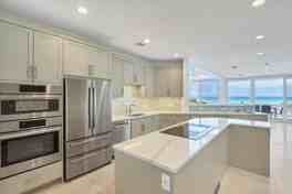 The kitchen is stocked with modern stainless steel appliances and features gorgeous counters, a curved island, and extensive storage with full cabinetry all while enjoying the breath taking views.