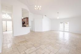 Well-kept West Boca home featuring 3 bedrooms and 2 bathrooms on a fully fenced corner lot with a spacious backyard. Recent improvements include fresh neutral paint, smooth ceilings (no popcorn), and updated lighting fixtures throughout the home, garage, and exterior. Travertine marble flooring runs through the living areas, highlighted by vaulted ceilings and abundant natural light. The updated kitchen offers wood cabinetry, granite counters, and stainless steel appliances. The primary suite includes two walk-in closets and a remodeled bath with an oversized walk-in shower. Additional features include a front-load washer/dryer, upgraded garage lighting, and thoughtful improvements that create a bright, welcoming feel. This home is move-in ready, modernized, and turnkey.