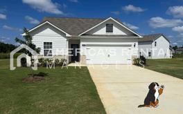 The master suite is privately tucked away and includes a generous walk-in closet and a comfortable en-suite bathroom. Two additional bedrooms are located off the main hall, sharing a second full bath, making this layout practical and convenient for families or those needing a home office. With everything on one level, the floorplan is easy to navigate and designed for comfort. The backyard provides room to enjoy the outdoors, and the community setting offers sidewalks and green space for walks or play. Pets are welcome, making this home a great fit for the entire household.