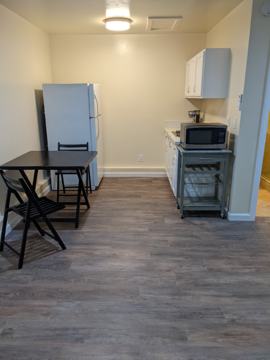 Separate studio near 60 & 710 Fwy. Includes walk-in shower, 2 closets, fridge, microwave (no stove/hookup), A/C-heater, dining table w/2 chairs. Street parking. No on-site laundry—laundromats nearby. Walking distance to ELAC, Ralphs, Starbucks (Atlantic Times Sq).