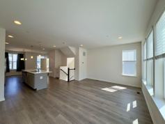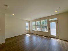 The entry opens into a bright living area with LVP flooring, neutral colors, and oversized windows that fill the space with natural light. The open-concept design seamlessly flows into the kitchen and dining area, creating the perfect setting for entertaining. The modern kitchen stands out with quartz countertops, sleek built-in cabinetry, and stainless steel appliances including a stove/oven, microwave, dishwasher, and refrigerator. A breakfast bar with pendant lighting adds both function and flair. From the dining area, step out onto the wide balcony where you can enjoy open, natural views in a private outdoor space. A convenient half bath is located on the main floor for guests.