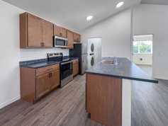 This beautiful apartment features luxury vinyl plank flooring, stainless steel appliances, air conditioning, washer and dryer, and storage units. Upper level units have balconies and vaulted ceilings. Lower floors have 9 foot ceilings for great reflection of natural light.