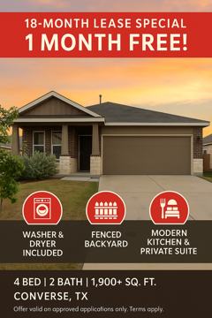 Limited-Time Lease Special: Enjoy 1 Month Free with an 18-Month Lease! Welcome to 10627 Penelope Way, a move-in ready Lennar Bradwell plan nestled in the desirable Paloma community of Converse, TX. Offering over 1,900 square feet of modern living, this spacious 3-bedroom, 2-bath home with a versatile flex room features an open-concept layout enhanced by sleek wood-look flooring and abundant natural light. The chef-inspired kitchen is equipped with granite countertops, a large center island, dark wood cabinetry, and stainless steel appliances—including a gas range, built-in microwave, dishwasher, and side-by-side refrigerator—while thoughtful upgrades such as a washer and dryer, water softener, tankless water heater, and programmable thermostat add comfort and efficiency. The private primary suite includes a dual-sink vanity, walk-in shower, and oversized closet, with two additional bedrooms and a bonus room that can easily adapt as an office, guest space, or play area. Outside, a fully fenced backyard with a patio complements the inviting front yard and two-car garage, while Paloma’s family-friendly amenities, including a playground and basketball court, combine with convenient access to Loop 1604, I-10, Randolph AFB, and nearby shopping and dining to create the perfect balance of comfort, style, and convenience.