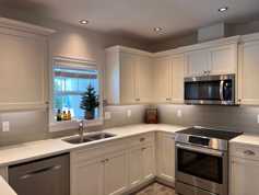 The master suite is very spacious with 2 closets (one walk-in) and a south facing private balcony. The ensuite includes 2 sinks, a bathtub and a separate shower with under cabinets and mirror lighting (activated by motion sensor).