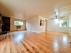 Spacious 3bd, 2ba single story house with approximately 1,270 sqft. Double pane windows and central heat throughout. Newly refinished hardwood flooring in the living room-dining room combo, linoleum flooring in the kitchen, tile in the bathroom, and carpet in the bedrooms. Ceiling fans in most rooms. Kitchen has tile counters, fridge, an electric cook-top, wall-mount oven, dining space, and a garbage disposal. The living room has a non-op fireplace (for decorative purposes only), and a wall-mount a/c. There's a shower-tub combo in the guest bathroom, and a single shower stall in the primary bathroom. Attached 2-car garage has laundry hookups and has lots of storage and work space. Additional vehicles can park in the driveway or street. Low maintenance yards include mulch, lawn, sprinklers, and an uncovered patio.