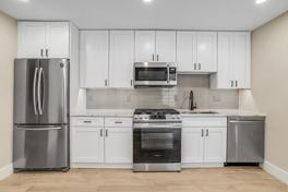 • Sleek kitchen with white counters & stainless steel appliances
