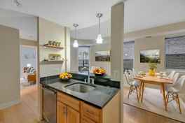 Modern kitchen with stainless steel appliances, granite countertops, hardwood-style floors, great natural light, energy-efficient upgrades