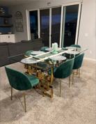 Step inside to a bright, open floor plan with abundant natural light, fresh neutral tones, and recessed lighting throughout. The spacious living and dining areas flow seamlessly, creating the ideal setting for family gatherings, entertaining, or simply relaxing at home. The dining space is elevated with a striking glass-top table featuring gold accents and rich velvet seating — perfect for dinner parties and special occasions.