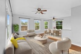 This beautiful home offers modern updates and a spacious, open layout just minutes from the heart of downtown San Antonio. Featuring 3 bedrooms and 2 bathrooms, this home is designed for comfort and functionality. Step into a modern kitchen with sleek cabinetry, polished granite surfaces, and laminate flooring that ties the entire space together. The bright, open interior is enhanced by large windows, filling the space with natural light, and ceiling fans in all bedrooms and the living area for added comfort. Step outside to a large, fenced backyard with a covered porch-perfect for outdoor relaxation or entertaining.