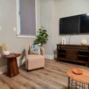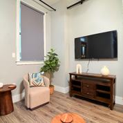 This beautifully appointed apartment is move-in ready with modern furniture and all essentials. Features include a spacious living room with Smart TV and queen-size sofa bed, dining bar seating for 4, fully equipped kitchen with appliances and cookware, private laundry area with washer/dryer, and a large bathroom with vanity and tub + shower. The bedroom offers a queen bed, Smart TV, desk, closet, and private balcony.