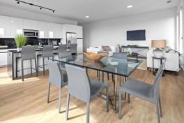 The open-concept kitchens include stainless steel appliances and a large center island perfect for entertaining, flowing seamlessly into living and dining areas. Each apartment offers in-unit washer/dryer, generous closet space, and high-end finishes throughout.
