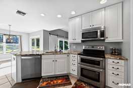 - Modern kitchen equipped with: double oven, electric stove top, and exhaust hood