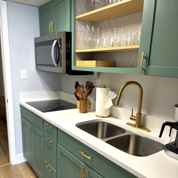 The bedroom has 2 queen beds, the kitchen includes a fridge, stovetop, microwave, and essentials, and the living area features another queen bed, sofa, armchair, and dining set. Step onto your private balcony to enjoy sunrises, ocean breezes, and the sound of waves.
