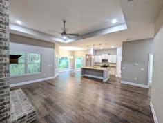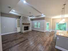 This stunning Craftsman home offers the perfect blend of charm and modern comfort. Step into the spacious open living area, featuring trey ceilings, a decorative fireplace, and extra storage. The kitchen is designed for entertaining, complete with granite countertops, sleek stainless steel appliances (range, microwave, and dishwasher), shaker-style cabinets with dovetail drawers and soft-close guides, a large island, stylish light fixtures, and a walk-in pantry.
