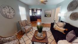 The home features a beautifully designed kitchen, complete with stainless steel appliances, including a dishwasher and a built-in bar seating area. The spacious living room, which opens up to the kitchen, is perfect for entertaining guests.