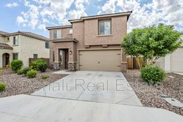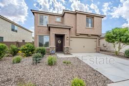 No Application Fees! Beautiful four bedroom plus den, three and one half bathroom San Tan Valley home with two primary suites and spectacular mountain views. This well maintained home features wood laminate flooring throughout the first floor, two tone neutral paint, upgraded two inch blinds, ceiling fans in each room, and twenty foot ceilings in the living room with a four panel patio door showcasing the backyard views. The upgraded kitchen includes granite countertops, tiled backsplash, upgraded cabinets, walk-in pantry, large island with breakfast bar, and stainless steel appliances. The first floor primary suite offers a walk-in closet, dual sink granite vanity, linen storage, and a tiled shower. A guest half bathroom and large laundry room with washing machine and dryer are also located on the first level. Upstairs you will find three additional bedrooms including a second primary suite, two full bathrooms, a loft, and a den with double doors that can be used as an office or bonus room. The backyard is perfect for entertaining and relaxation with a covered patio, synthetic grass, easy to maintain landscaping, open view fencing, and no neighbor directly behind the property.